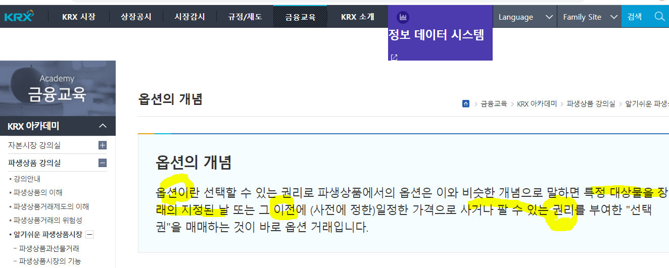 ㅡ옵션이 선물과 다른 점은, 미리 정한 가격에 계약을 반드시 체결해야 하는 것이 아니라, '권리'를 거래할 수 있는 것인데,