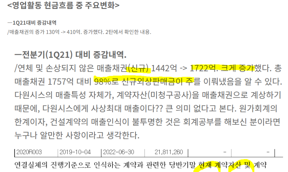 ㅡ1Q21. 다원시스 영업활동현금흐름 주요 차감내역이다. 자세한 분석내용은 6탄 링크(아래)를 들어가면 확인 가능하다.