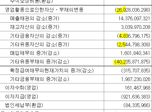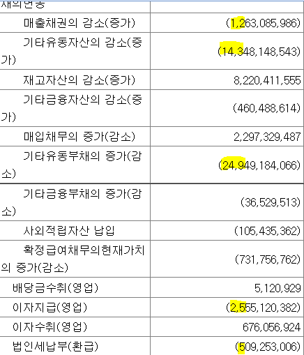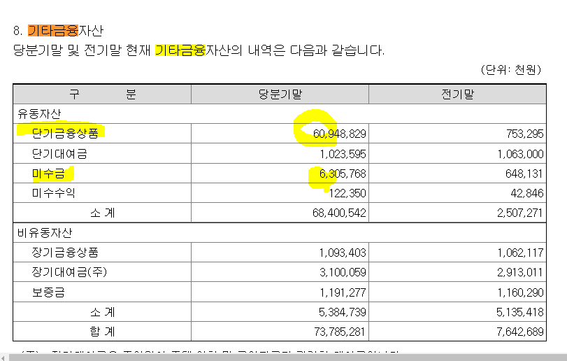 /단기금융상품의 증가와, 미수금(영업외 못받은 돈 <>매출채권)의 증가가 보인다.