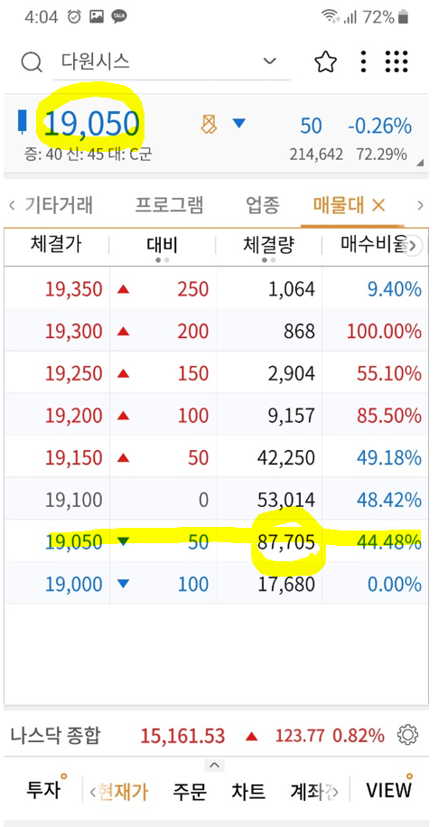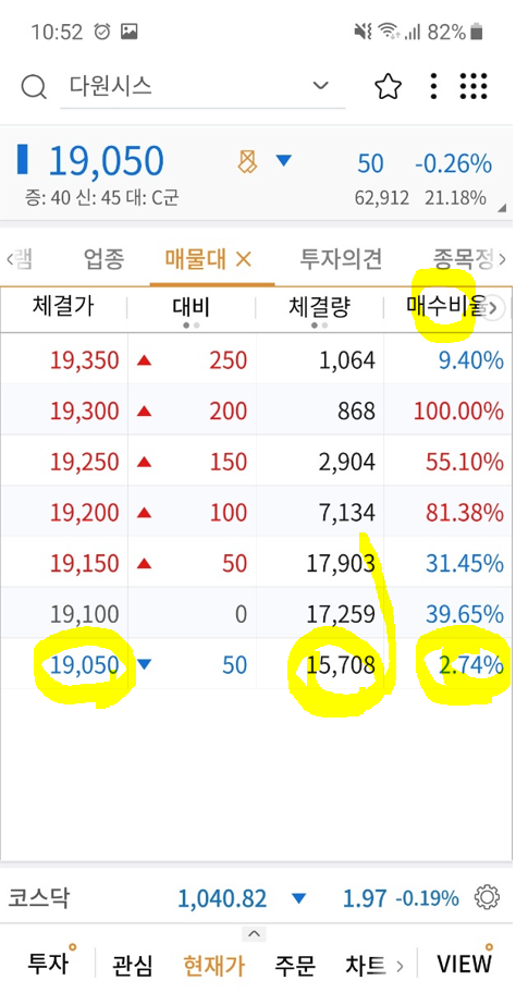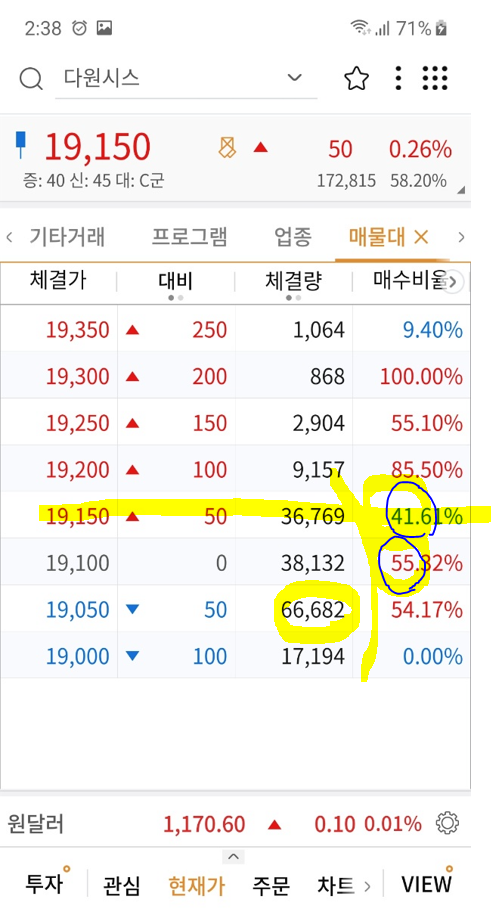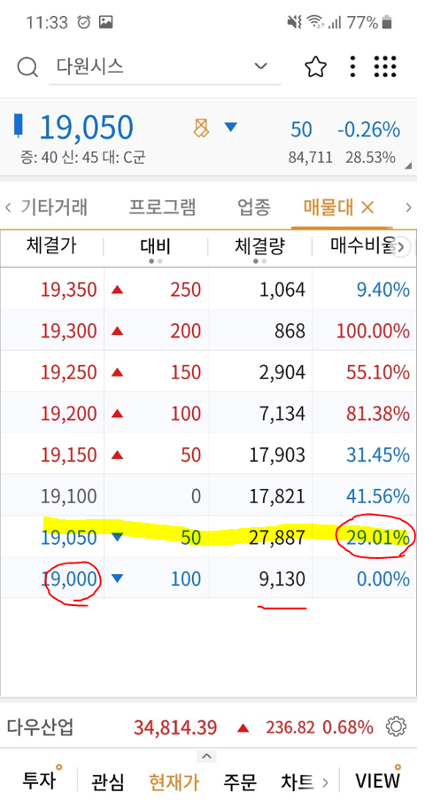 ㅡ 현재가 머무르는 매물대 19,000원에 저가 형성 이후 19,050에 체결량 15,708 ㅡ> 27,887주로 늘어났으며, 매수 비율 2.74%ㅡ>29.01%로 늘어난 것이 보인다.