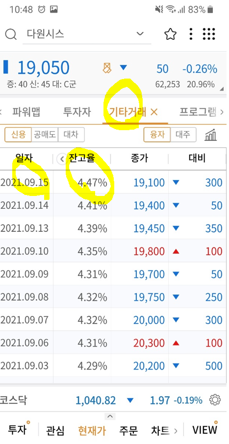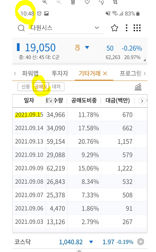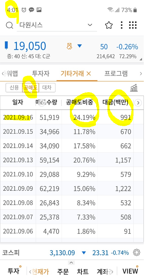 /장 마감 후, 당일 공매도 대금 및 거래비중 확인했다.