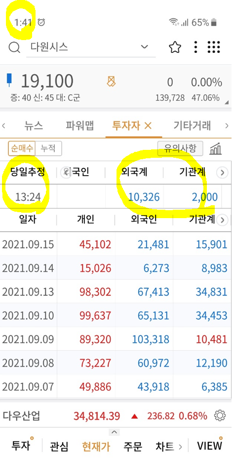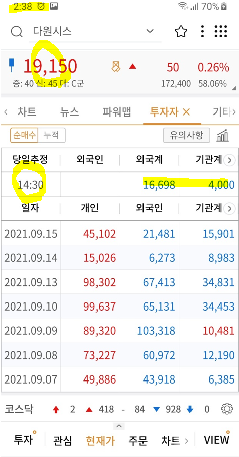 ㅡ다음 당일 추정 시간인 14시 30분대에 와보니, 외국계 6천 주 순매도 늘었으며, 기관계 순매도 2천 주 늘어난 모습 보인다.