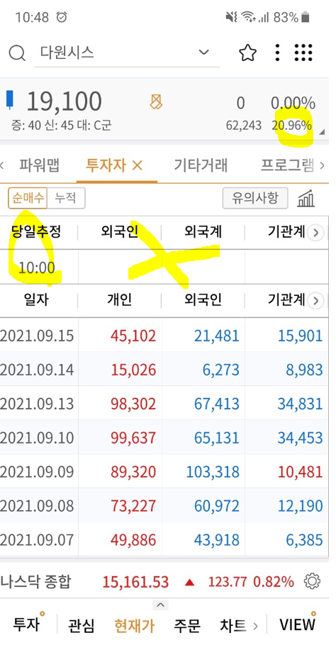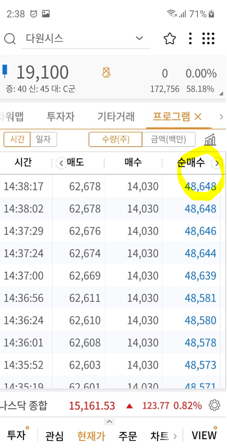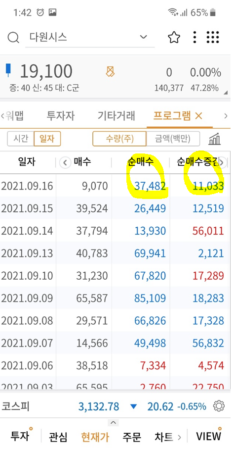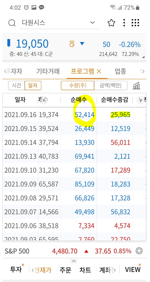 /그렇다면 지금은 매수 타이밍일까 매도 타이밍일까?? 당일 추정치 외국인, 기관 순매도 보였으며, 프로그램 순매도량 크게 확대되는 것이 보이므로, 일단 지켜보고, 장 끝나고 시간 외 거래로 매수 노려보기로 했다.