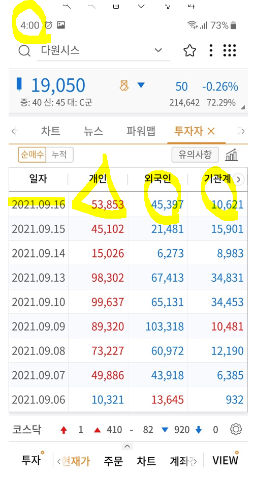 ㅡ 장 마감 후 4시에 들어가 보니, 당일 증권사 거래내역이 보인다. 예상대로 외국인의 큰 매도 물량 보이며, 개인이 받아냈음이 보인다.