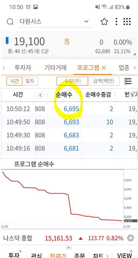 ㅡ프로그램 순매도량 6,695주 ㅡ> 13,453주로 매도 물량 2배 증가했음이 보인다.