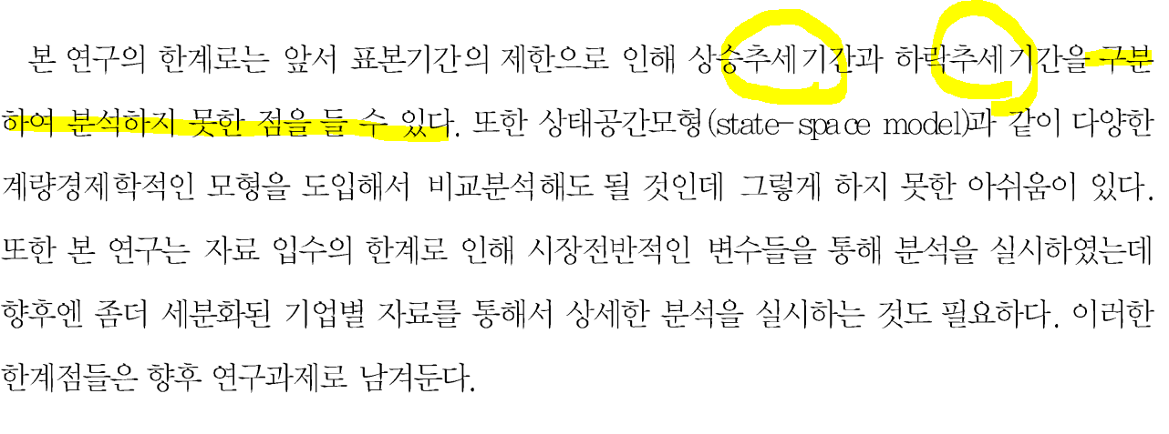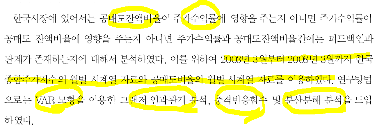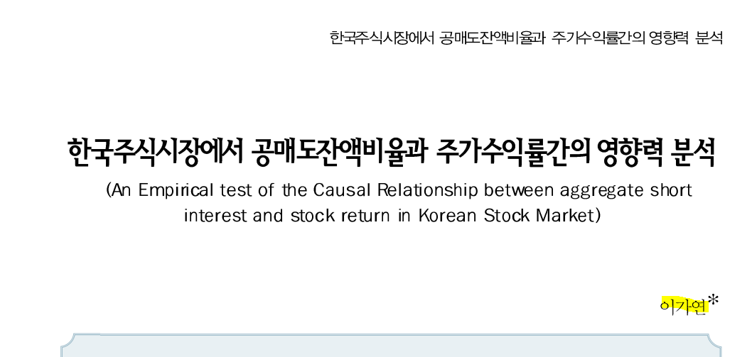 ㅡ 그랜저 인과관계(Granger Causality)는 한 변수의 변화가 시차를 두고 다른 변수에 영향을 미치는 경우를 말하는데, 코스피수익률과 공매도잔액비율이 그랜저 인과관계가 있었고, 수익률이 저조할때 공매도 잔액비율이 커졌다는 말.