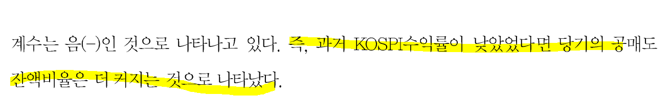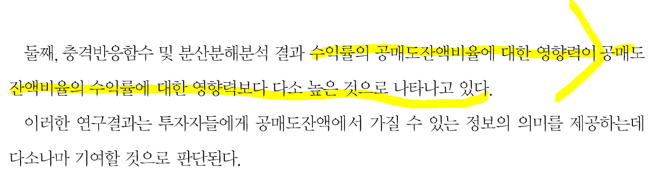 ㅡ수익률이 공매도잔액비율에 미치는 영향력이 더 크다는 말로, 공매도 잔고가 증가했으니 주가가 하락할꺼라는 해석보다, 주가가 하락했으니 공매도가 많이 나오겠네 라는 해석이 더 연관성이 높다는 말.