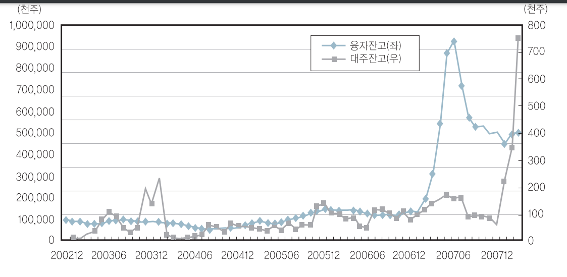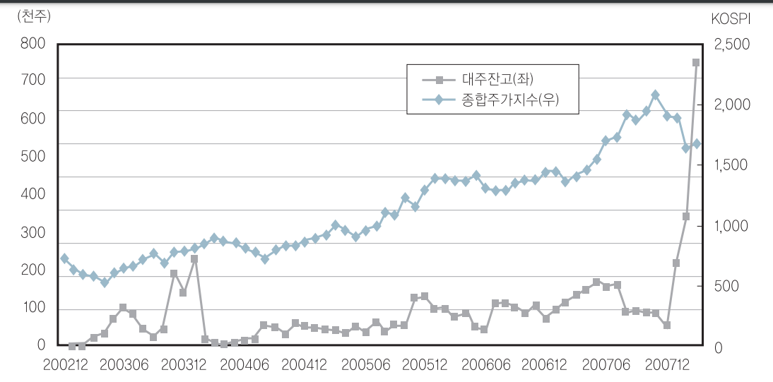 ㅡ대주잔고와 종합주가지수 비교. 공매도와 주가수익 상관관계 확인위한 자료로 금감원 통해 확인 가능한 대주잔고를 기준으로 분석해봤다고 함. 한계성 있음.