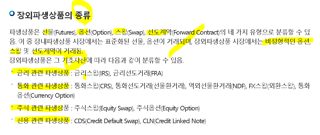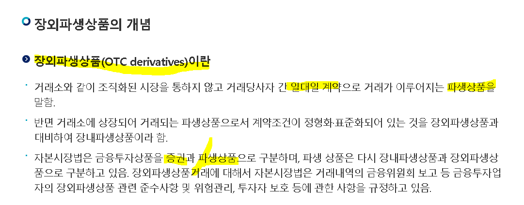 ㅡ장외파생상품의 정의. 일대일 계약으로 거래하는 파생상품을 의미하는데,