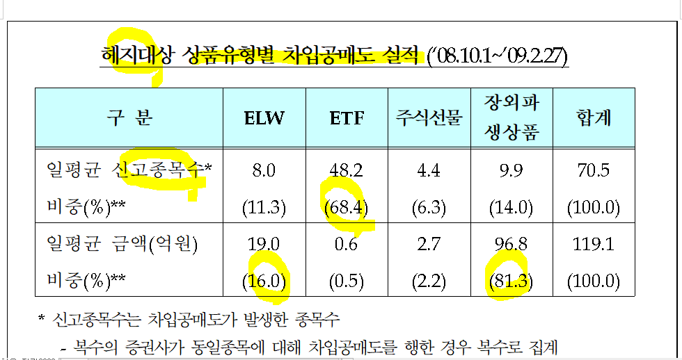 ㅡ헤지대상 상품유형별 차입공매도 실적. 종목수는 당연 ETF가 많고, 금액은 장외파생상품, ELW 순으로 컸는데,