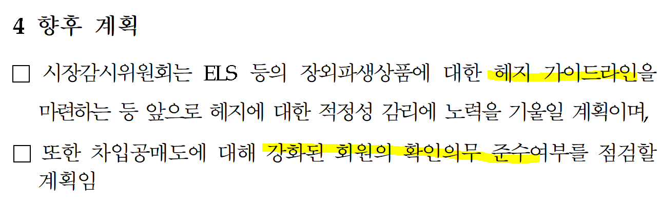 ㅡ장외 파상상품 등 헤지 가이드라인 마련, 차입공매도 강화된 회원의 확인의무 준수여부 점검 계획.