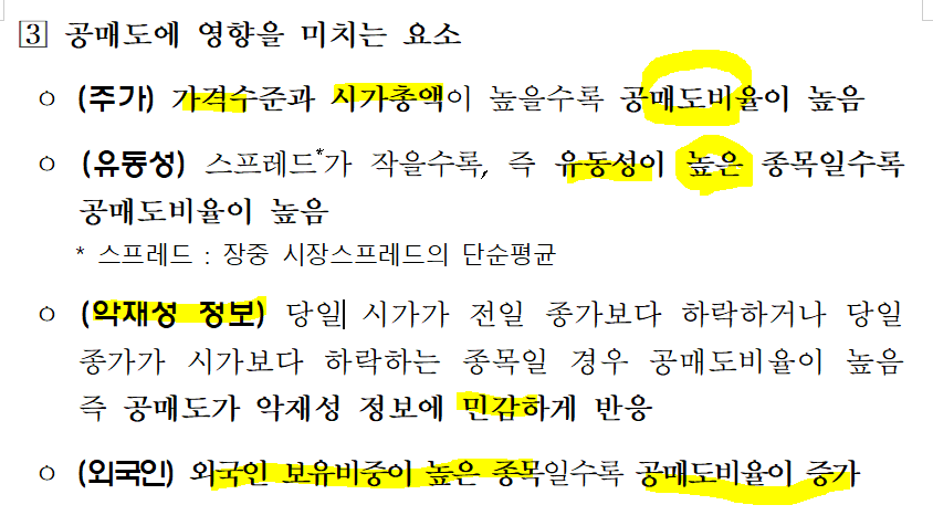 /~주가와 시총이 높을수록/ 유동성이 높을수록/ 외국인 보유비중이 높을수록/ 공매도 비율이 높았으며, 악재성 정보에 민감하게 반응한 모습 보임.