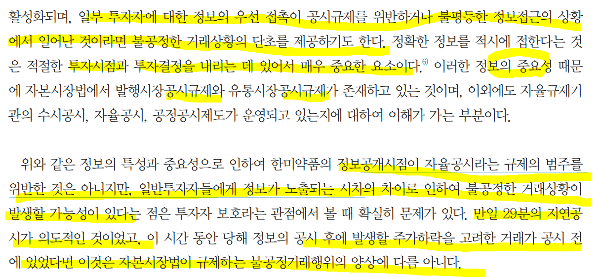 ㅡ투자시점과 투자결정에 매우 중요한 요소인 정보. 자율공시 규제 위반은 아니나, 정보 노출 시차의 차이와, 그 사이에 주가하락을 고려한 거래가 있었다면 자본시장법이 규제하는 불공정거래행위의 양상에 다름 아니다.