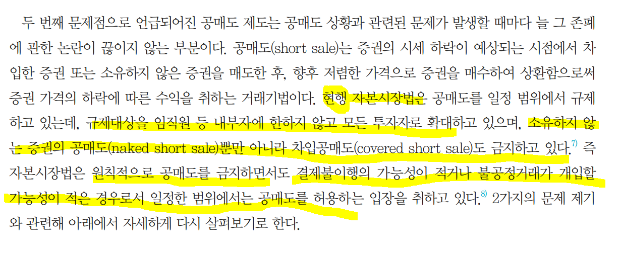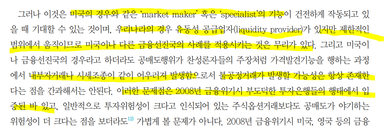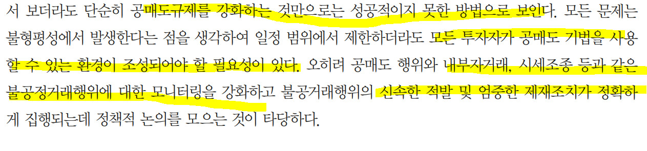 ㅡ공매도 규제 강화보다, 모든 투자자에게 형평성 있게 공매도 허용하고, 불공정거래행위에 대한 모니터링을 강화하는 등의 방식이 타당하다.