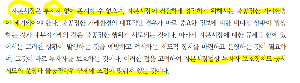 ㅡ자본시장의 가격형성기능의 정상 작동을 위하여, 중요한 정보의 적시공시와 거래행위의 공정성이 담보되어야 한다.