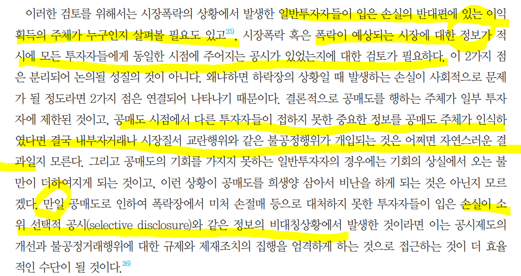 ㅡ공매도 이익획득의 주체 파악, 공매도 시점에서 정보의 비대칭성 있었는지, 내부자거래 등 불공정행위 개입되었는지 등 파악 필요.