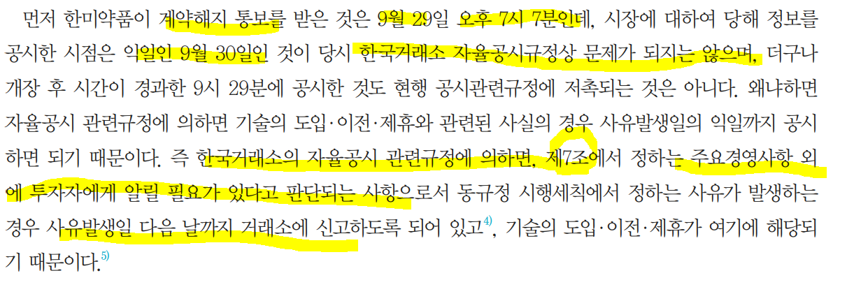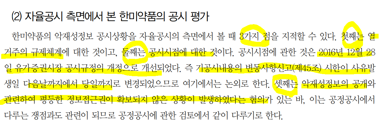 ㅡ자율공시 측면에서 본 한미약품 공시의 3가지 문제점. 2016.12월 기공시 내용의 변동사항 신고 시한이 사유발생일 다음날 ㅡ> 당일까지로 변경됨.