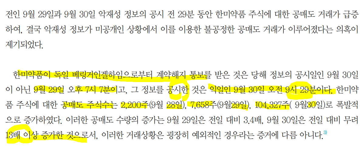 ㅡ한미약품의 늦장공시와 불공정거래 의심되는 공매도의 13배 증가.