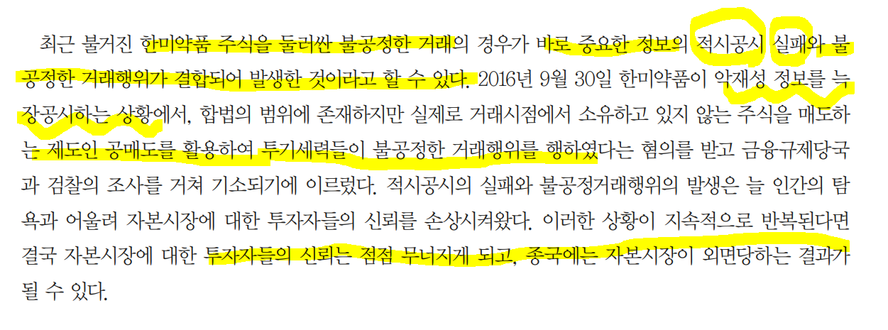 /2016.9.30. 한미약품 불공정 거래 사건. 악재성 정보의 늑장공시(자율공시 사항)와 투기세력의 대량 공매도.