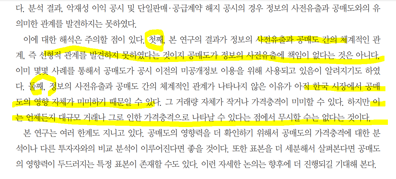 ㅡ연구의 한계성. 사전유출현상의 심각함은 밝혔으나, 공매도 거래량과의 인과관계는 밝히지 못함.