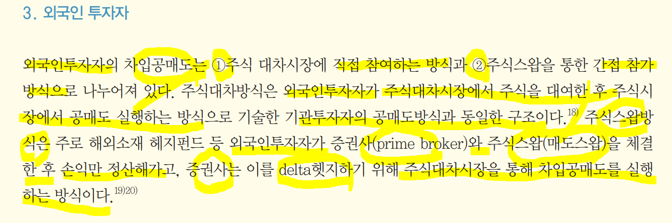 ㅡ투자자별 공매도 프로세스. 대차거래 or 스왑방식으로 공매도하는 외국인 투자자.