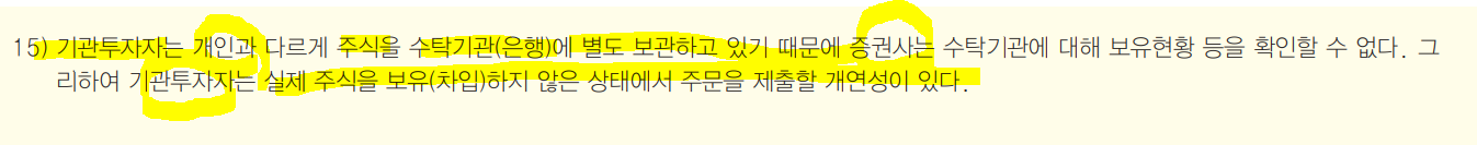 ㅡ기관투자자는 법인형태를 취하고 있으며, 주식을 수탁기관(은행)에 보관하고 있기 때문에 증권사가 실제 주식을 보유(차입)하지 않은 상태에서 주문을 제출할 개연성이 있다는 말.