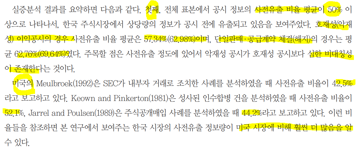 ㅡ사전유출비율 이익공시와 단일판매,공급계약 체결공시에서 평균 50%이상 나타남.