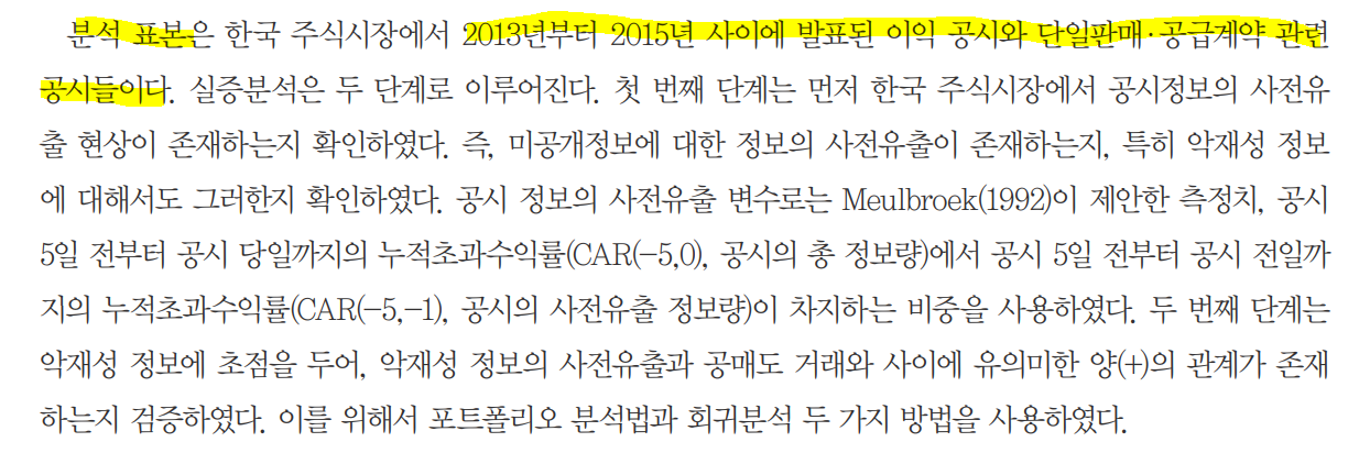 ㅡ사전유출비율 이익공시와 단일판매,공급계약 체결공시에서 평균 50%이상 나타남.