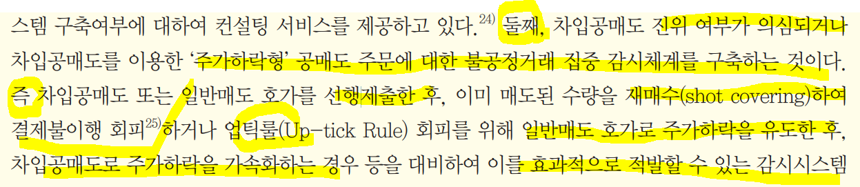 ㅡ개선방안. 현 한계점. 업틱룰 있어도, 일반매도 호가로 주가하락 유도한 후 차입공매도로 주가하락 가속화 하는 등의 불공정거래 가능한 '주가하락형'공매도 주문에 대한 집중 감시체계 구축 필요.