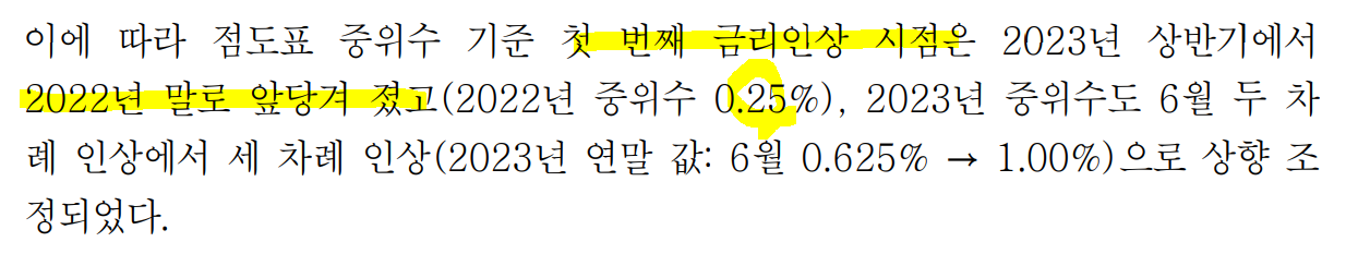 ㅡ첫 번째 금리인상 시점 2022년 말로 앞당겨 짐.