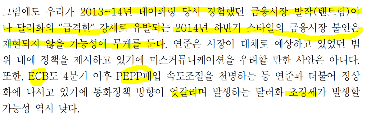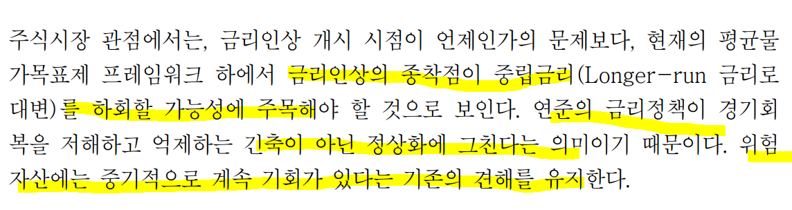 ㅡ금리인상이 긴축이 아닌 정상화로 향하여 위험자산에 계속 기회가 있을 것으로 봄.