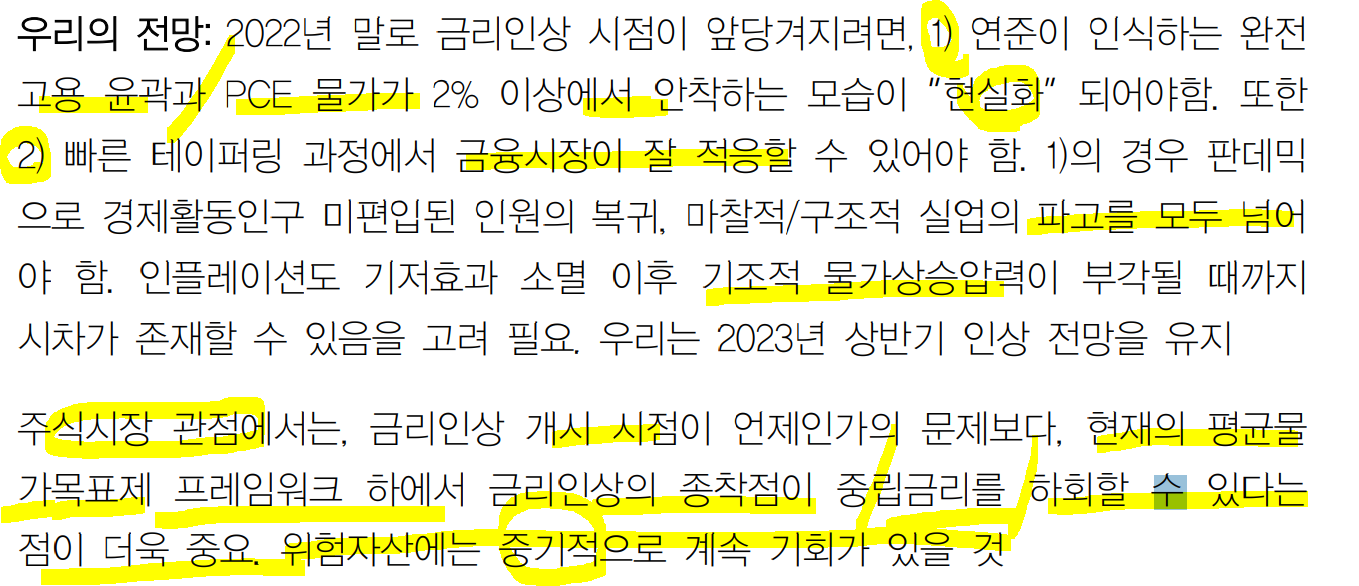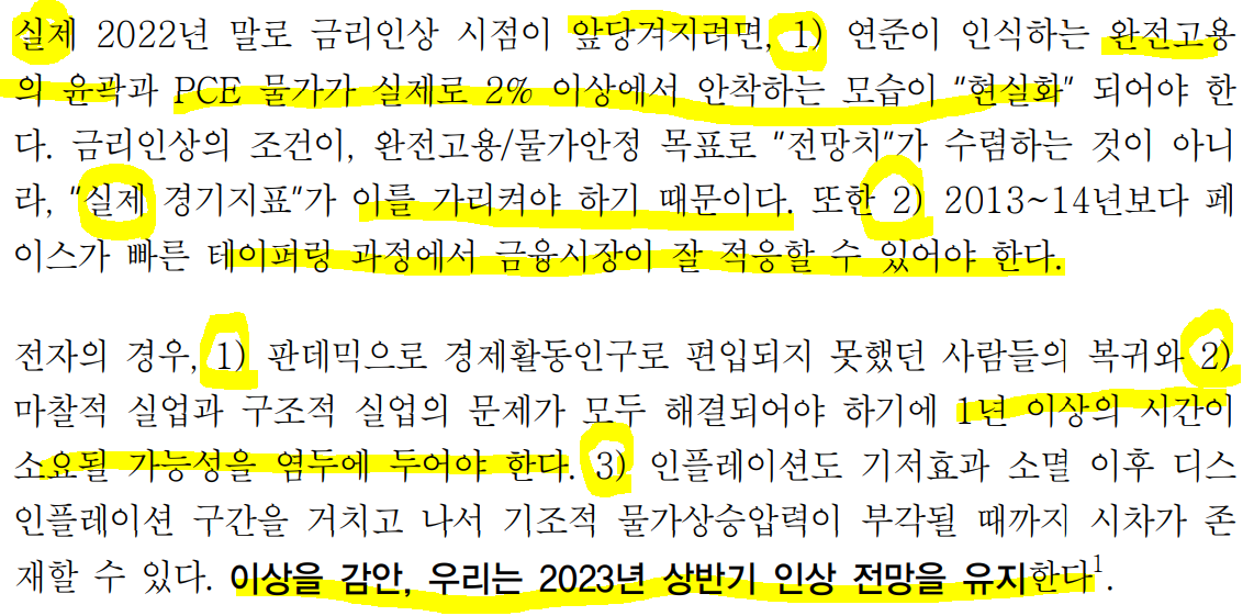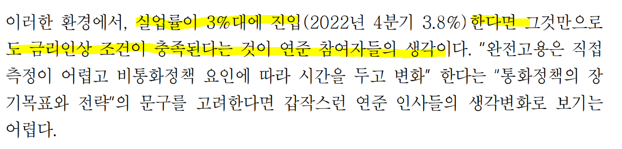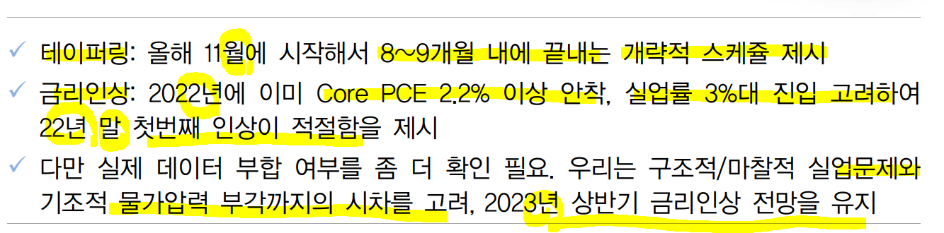 ㅡ완전고용까지 상당시간 소요 가능. 기조적 물가상승압력 까지 시차 존재할 수 있어 2023년 상반기 인상 전망을 유지.
