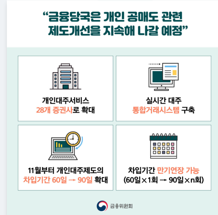 ㅡ11월부터 개인 공매도(대주거래) 차입기간 확대와 무제한 연장 가능하다는 금융위원회의 홍보자료가 나왔다. 금융위에 따르면 개인 공매도가 지난해보다 41% 증가했다고 한다.