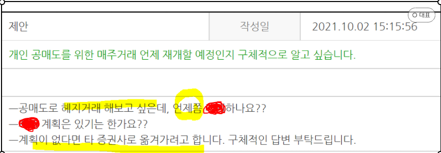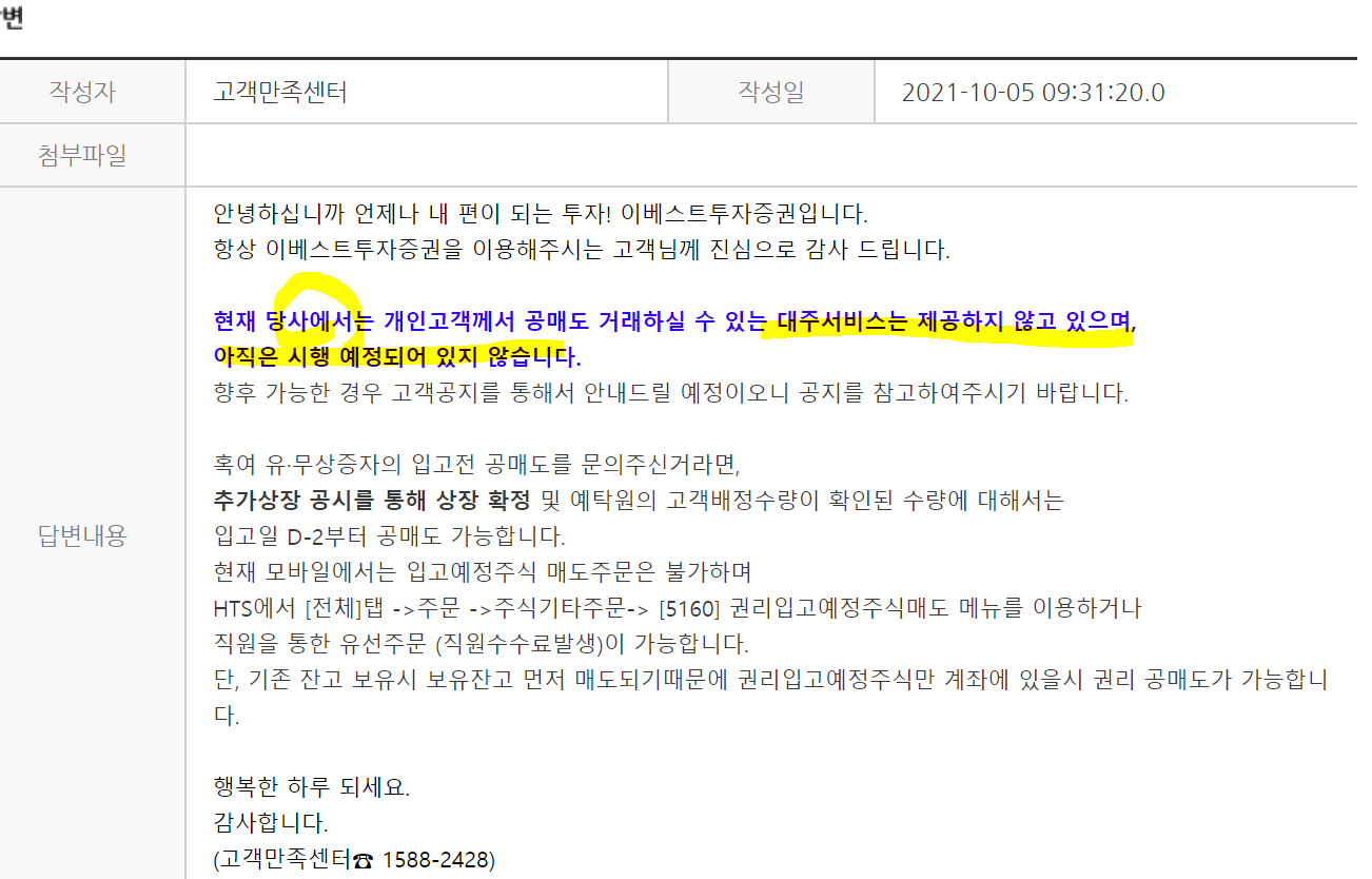 /하지만, 이용중인 이베스트 투자증권에 문의해 본 결과, 시행 예정 없다는 답변을 들었다. 그래서 현재 시행 중인 증권사 중에 사전에 공모주 청약으로 계좌 만들어 두었던 NH투자증권 나무에서 대주거래를 해보기로 했다.