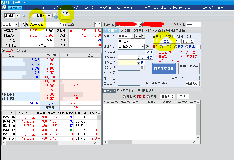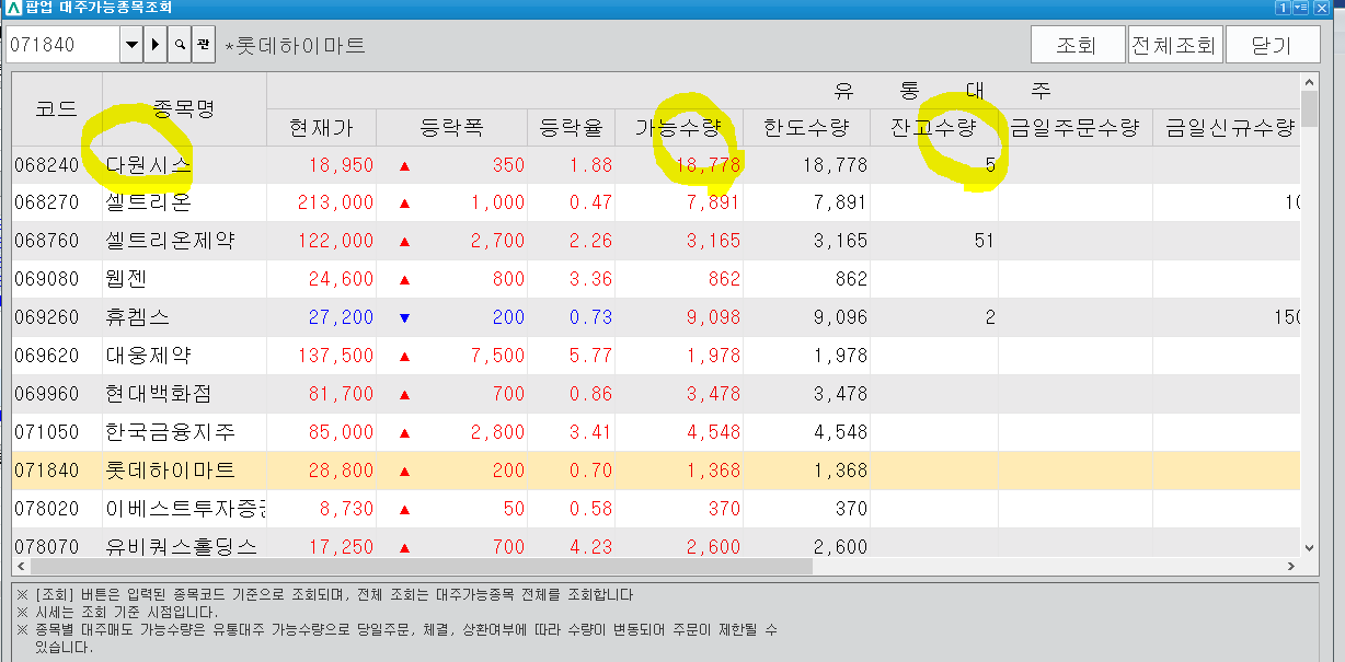 ㅡ대주 주문 화면에서 '대주가능 종목조회'를 하면,