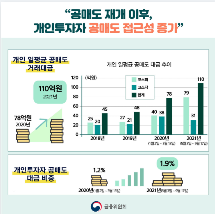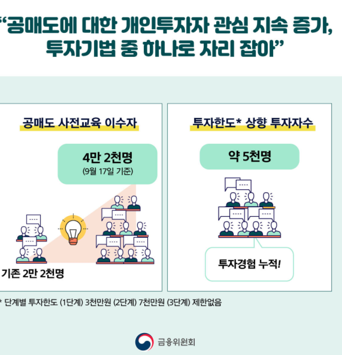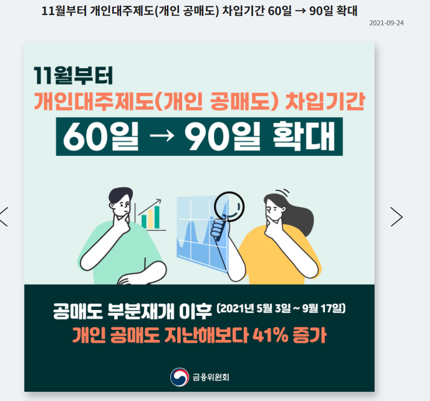 ㅡ11월부터 개인 공매도(대주거래) 차입기간 확대와 무제한 연장 가능하다는 금융위원회의 홍보자료가 나왔다. 금융위에 따르면 개인 공매도가 지난해보다 41% 증가했다고 한다.