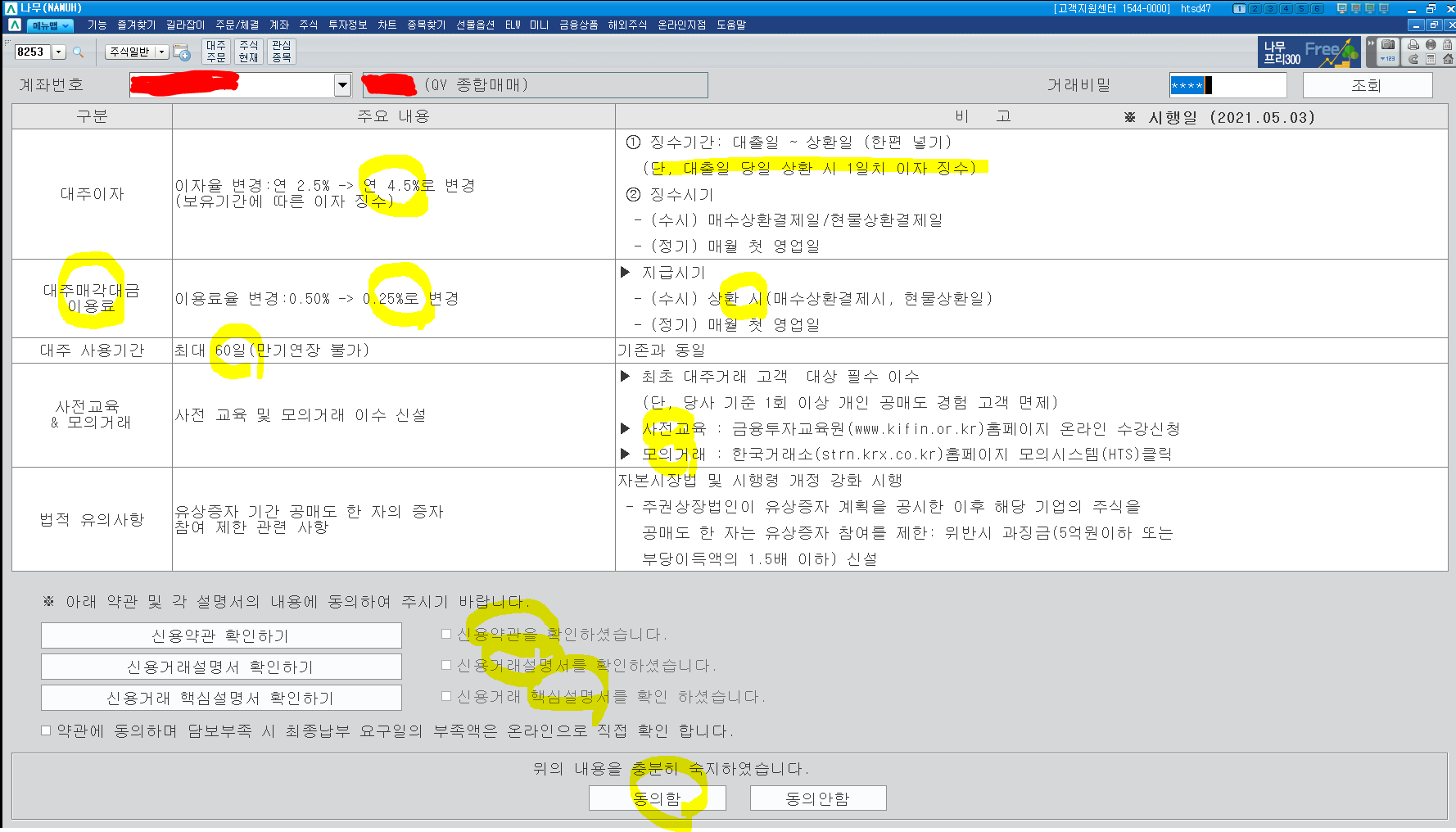 ㅡ아직은 10월이니 업데이트 되지 않아서 대주 사용기간 60일로 보인다. 눈에 띄는 건 대주이자 연 4.5%, 대주 매각대금 이용료 연 0.25% 가 보인다.