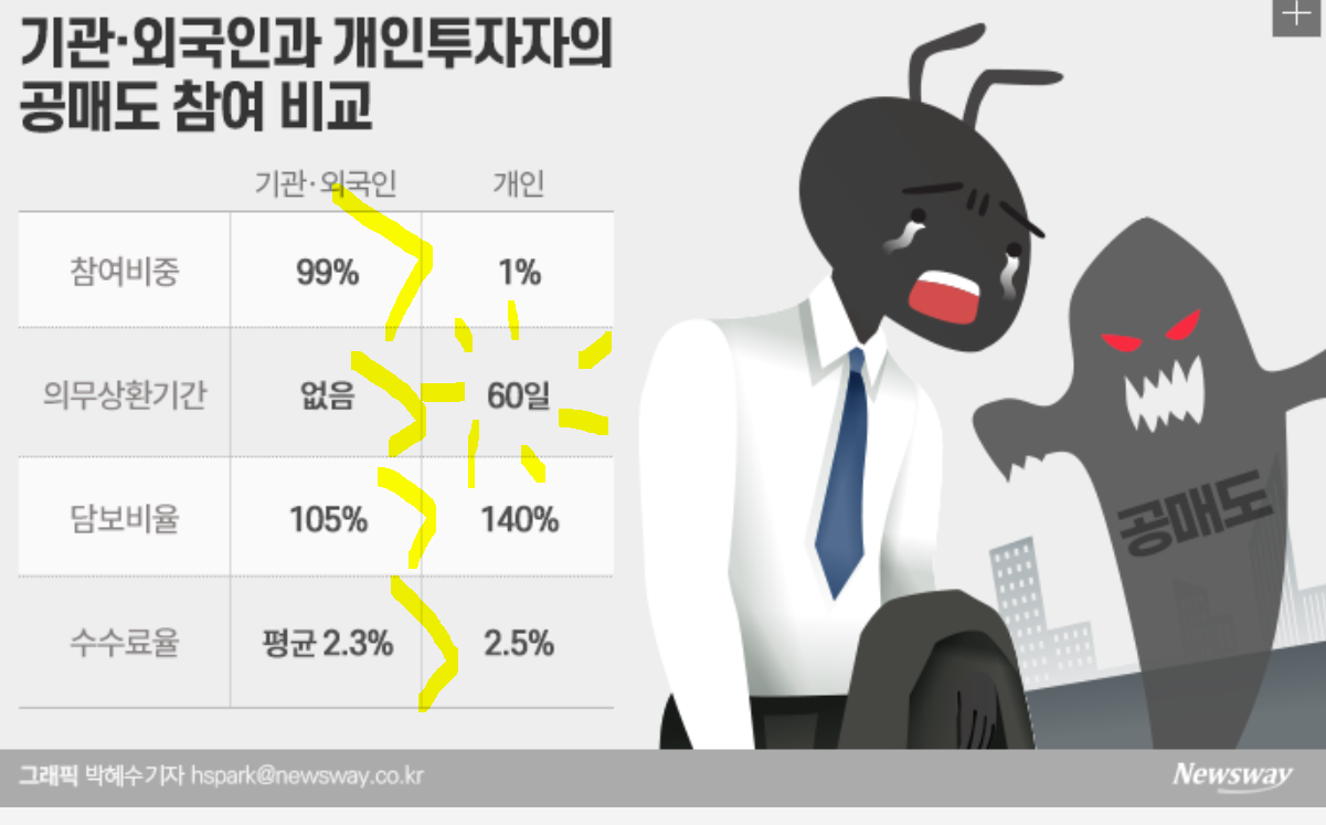 /애초에 문제가 되는 논점은 공매도와 주가의 유의미한 관계가 아니라, '외국인과 기관에 과도한 혜택을 주는 시스템' 이 문제인데.. 개인의 공매도 상환일을 연장시켜 준 들, 초등학생을 UFC경기에 파이터들과 싸우게 하는 꼴이다.