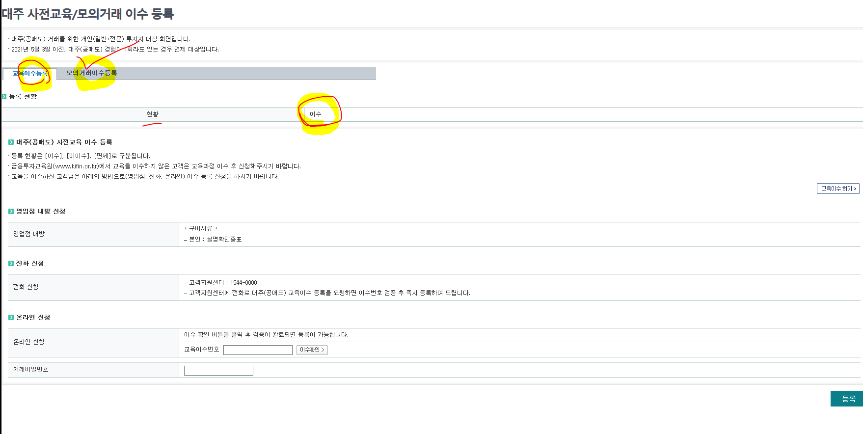 ㅡ대주 사전교육과, 모의거래 이수내역을 등록하는 페이지. 현재 등록한 상태이므로 '이수'라고 뜬다.