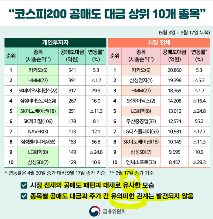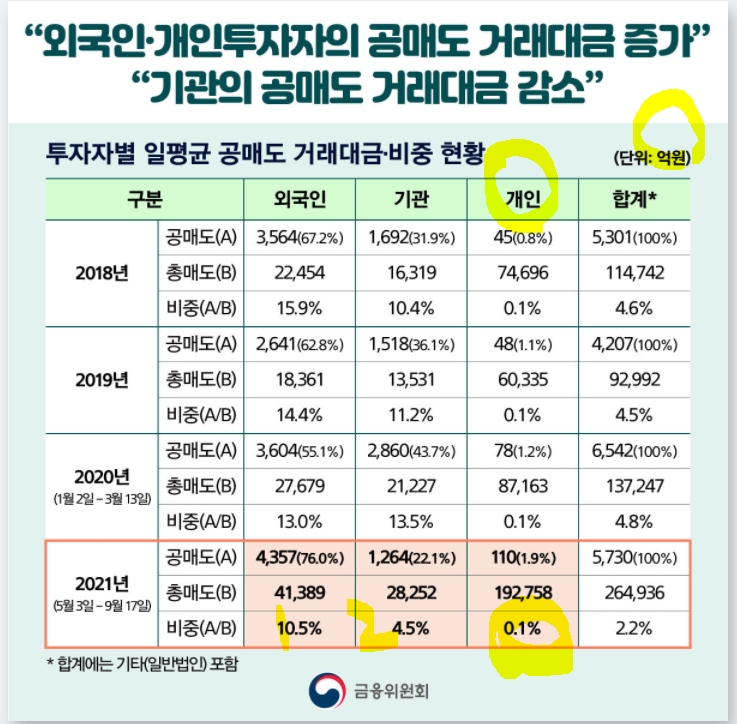 ㅡ이 자료는 좀 웃기다고 생각한다. 애초에 개인 공매도 비중이 0.1%인데, 외국인과 기관이 장악한 거대한 바위 같은 시장에 계란을 던져봤자 깨지기만 하는데, 어떤 개인이 시장에 반하는 공매도를 할 수 있다는 말인가??