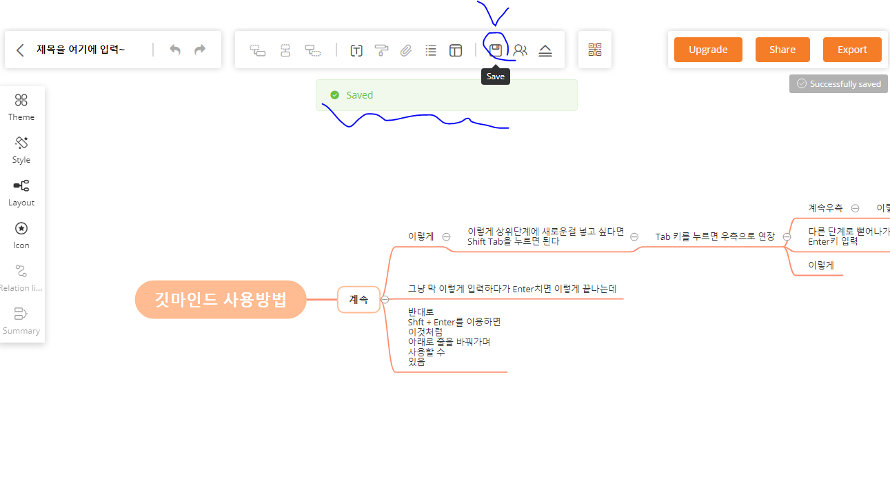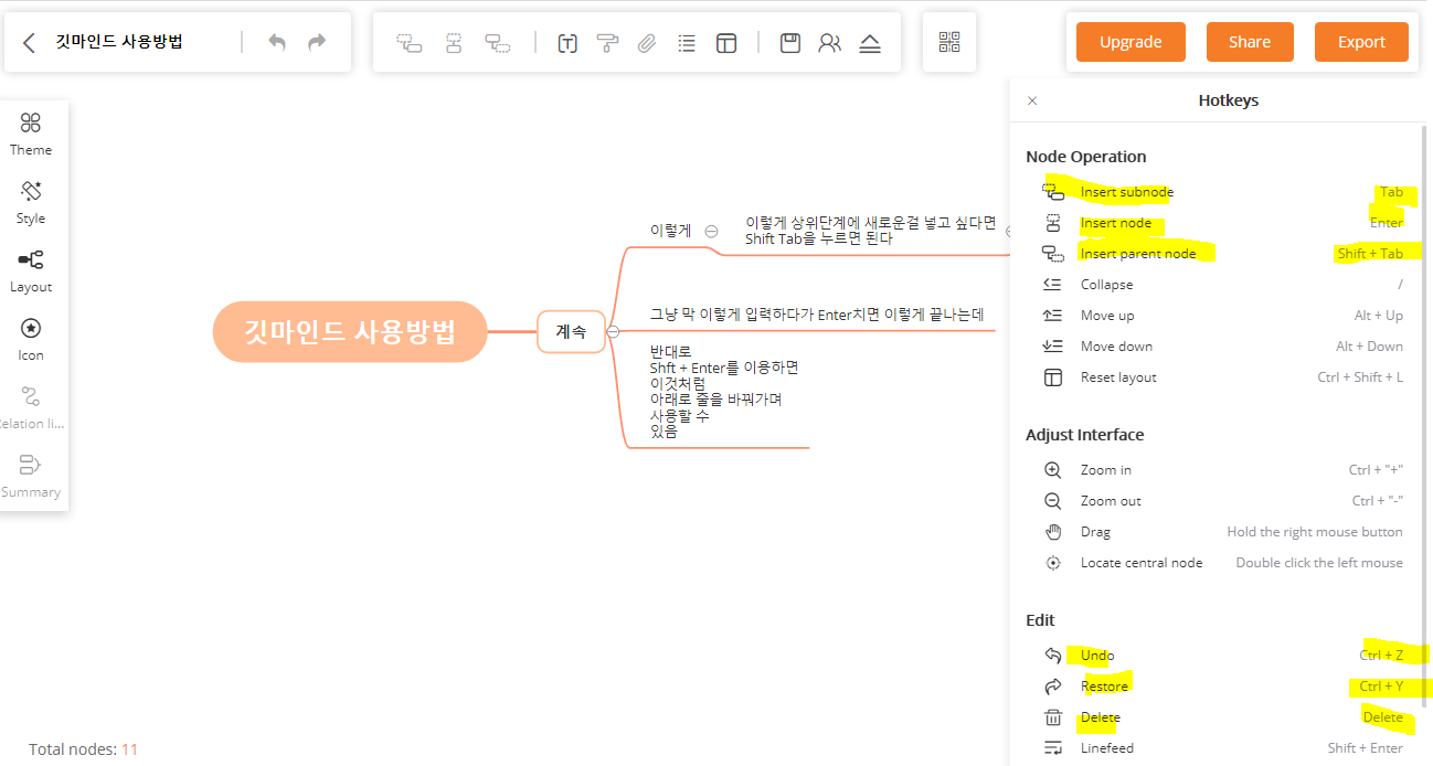 또한 내용을 입력하다가 그냥 Enter를 누르면 노드가 완성되는데, Shift + Enter를 누르면 한칸 내려서 글을 작성할 수 있다.
