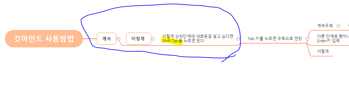 상위노드(상위단계)를 삽입하고 싶으면 Shift Tab을 누르면 된다.