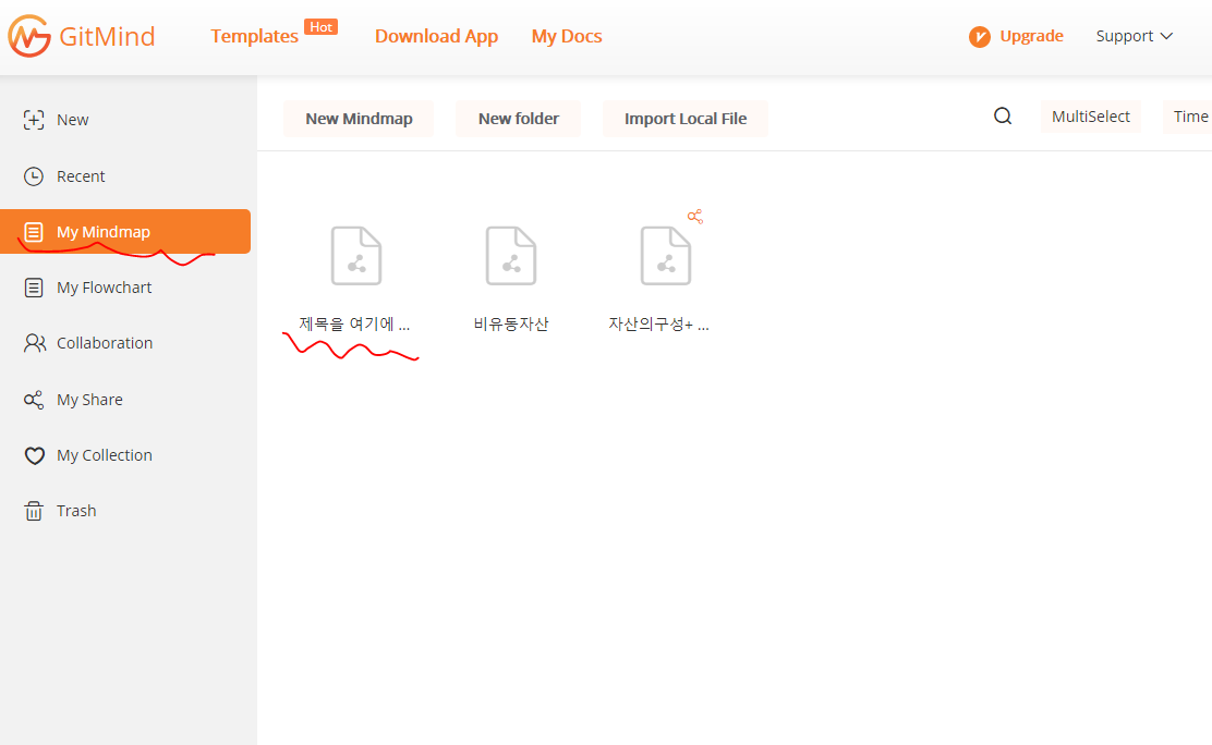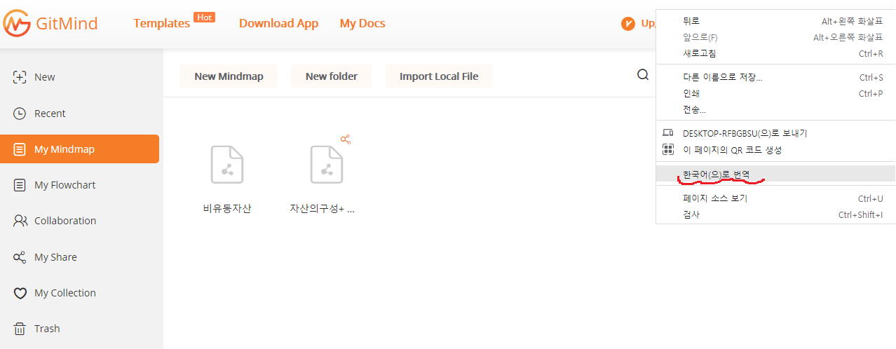 나가면 처음 본 화면에서 번역이 풀린 상태 My mindmap이 아래와같이 보이고, 내가 저장한 파일이 보이게 된다.