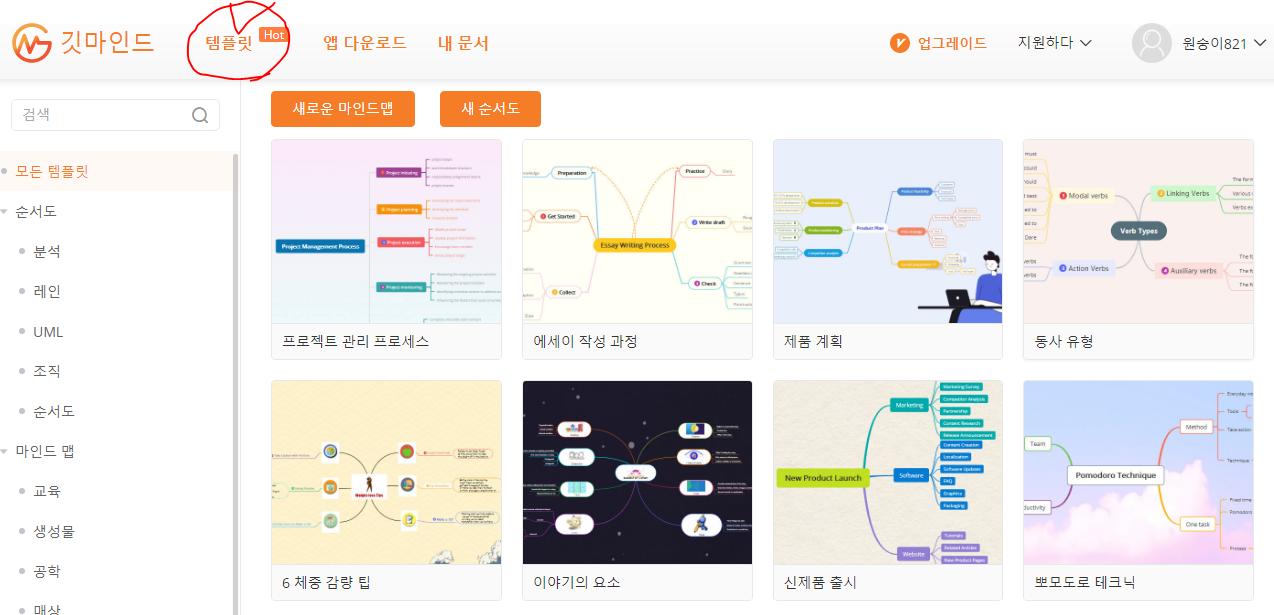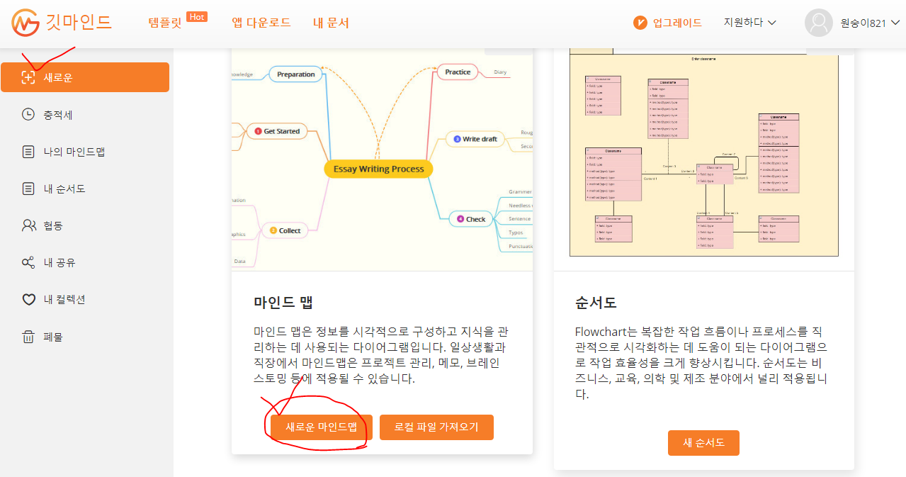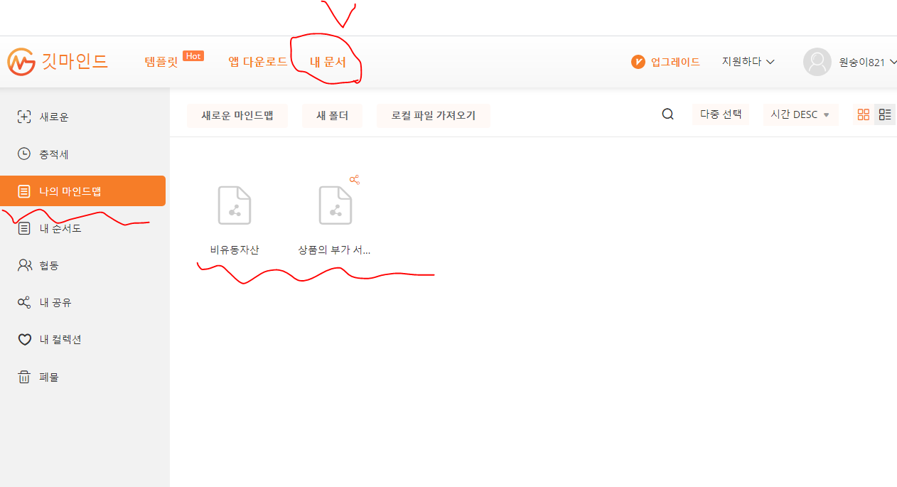 무료이면서, 상단의 내문서를 클릭하면, 아래와 같이 나의 마인드맵을 저장할 수 있어 편리하다.