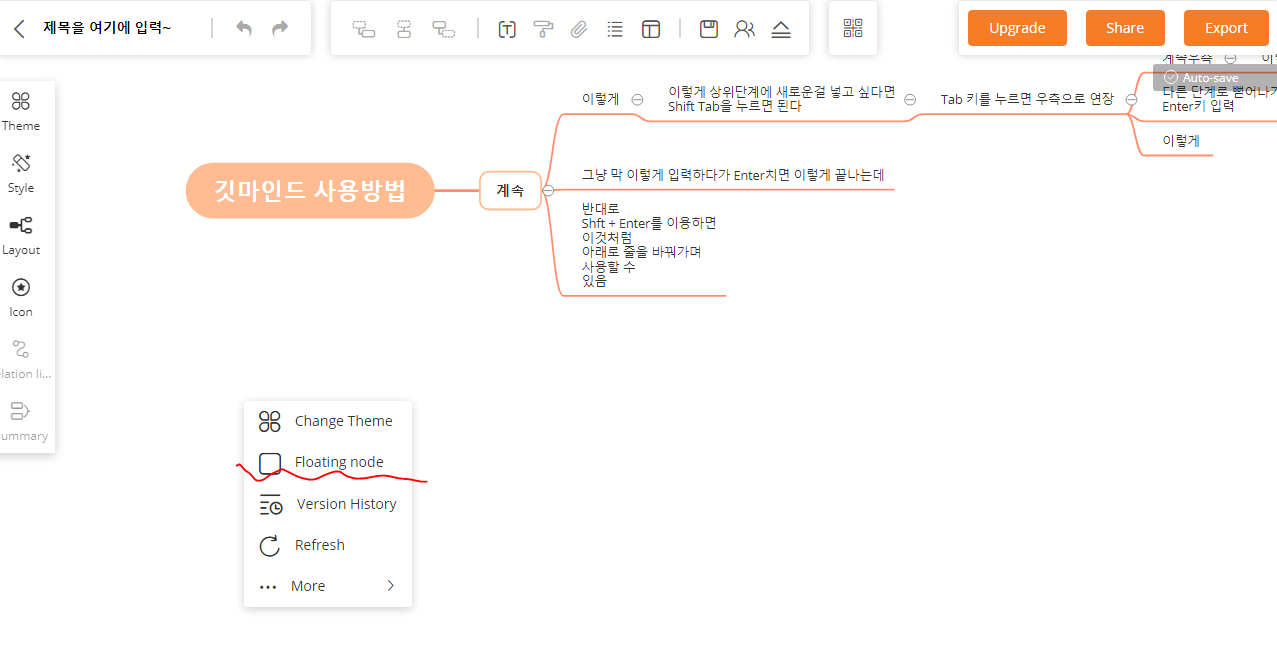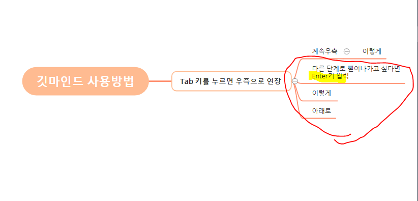 일반노드(하위단계가 아닌 같은 단계)를 삽입하기 위해서는 Enter키를 누르면 된다.