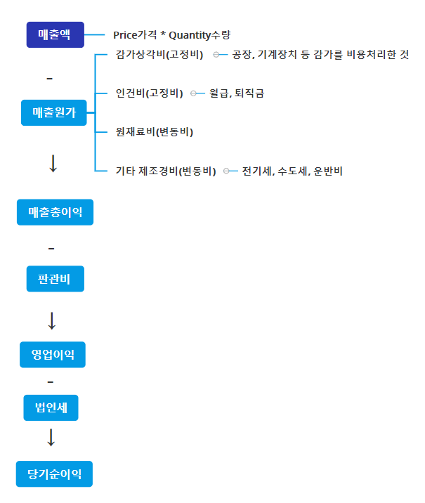 매출액과 그 구성항목에 대하여 도식화 해봤다.