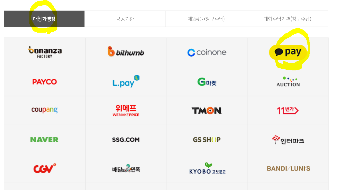제휴현황. 대형가맹점 중 11.3. 상장예정인 카카오페이가 보인다.