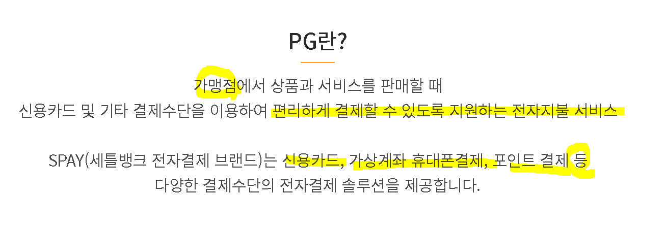 PG 찾아봤더니, Payment Gateway의 약자로, 카드로 결제를 하려면 카드사와 '가맹점 계약'을 맺어야 하는데, 중소형 상점들은 어려우니, 중간에서 대신 해주고 수수료 받는 식.