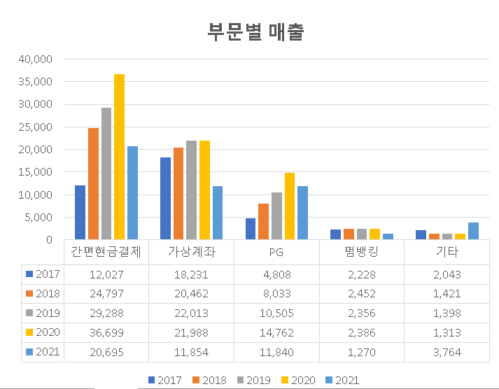 간편현금결제 > PG > 가상계좌 > 펌뱅킹 > 기타 로 순으로 보이고, 기타부문 위에서 확인한 1회성 기타수익으로 크게 증가했다.