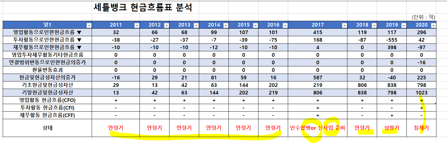 세틀뱅크의 10년치 현금흐름을 들여다 보자.
